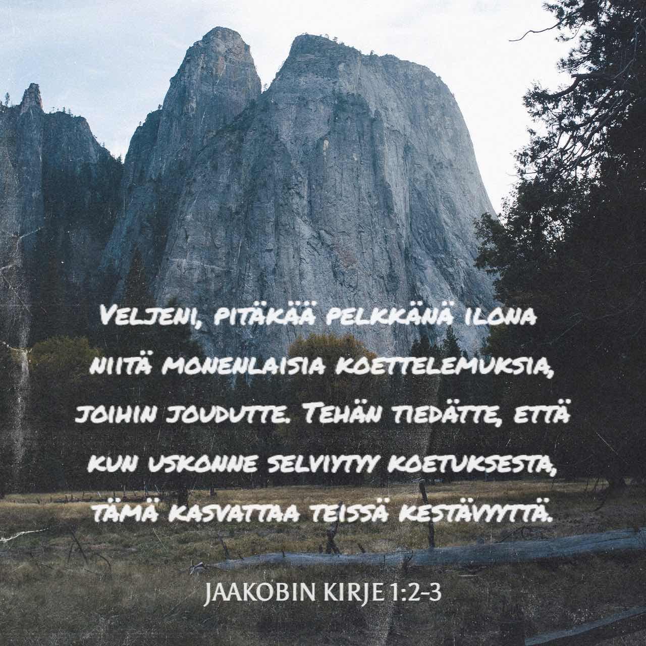 ”Veljeni, pitäkää pelkkänä ilona niitä monenlaisia koettelemuksia, joihin joudutte. Tehän tiedätte, että kun uskonne selviytyy koetuksesta, tämä kasvattaa teissä kestävyyttä.” (Jaakobin kirje 1:2-3)