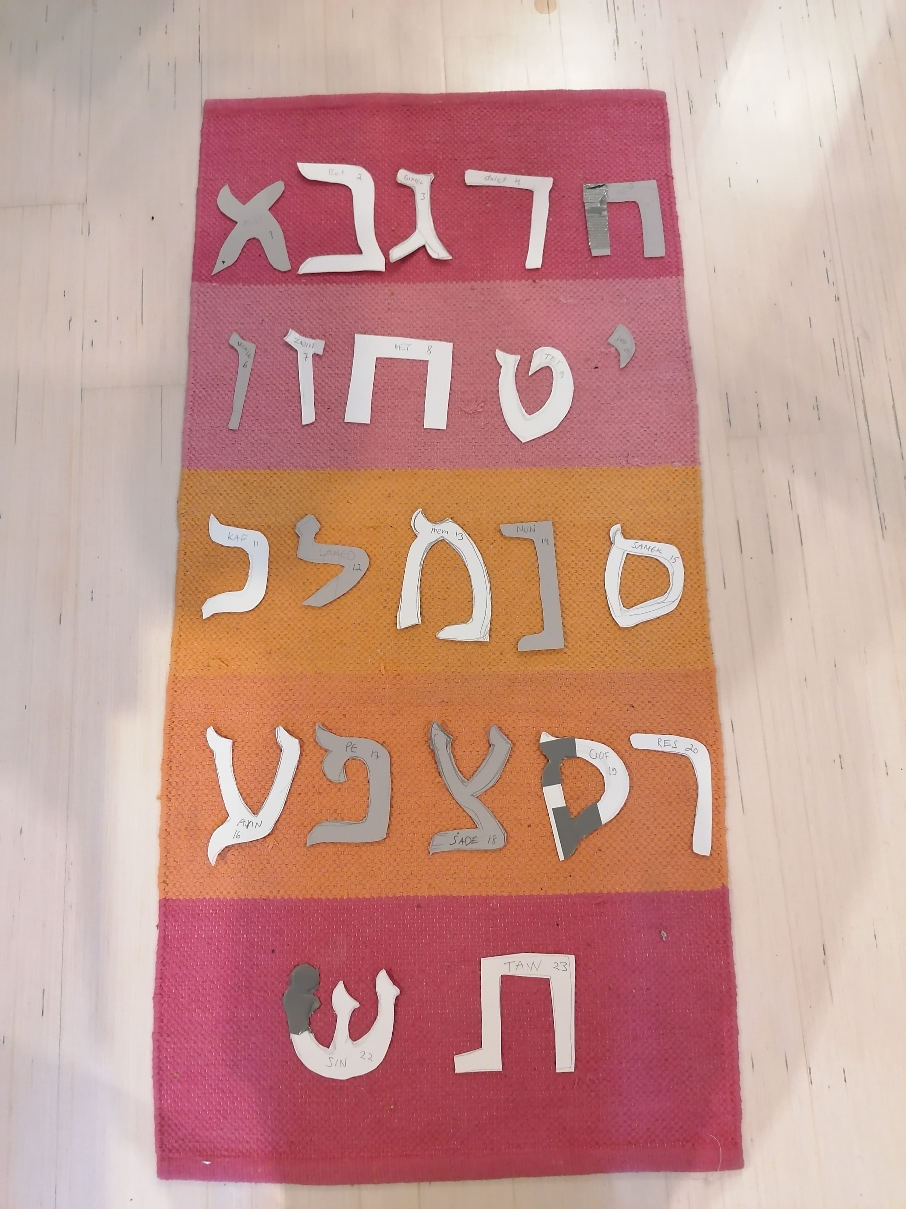 Aloitan pahvikirjainmenetelmän esittelemällä ensin kaikki konsonantit. Ne on aseteltu matolle aakkosjärjestyksessä. Ne ovat vasemmalta oikealle lueteltuna: Alef, bet, gimel, dalet, he, waw, zayin, het, tet, jod, kaf, lamed, mem, nun, samek, ayin, pe, sade, gof, res, sin, tsin, ja taw.